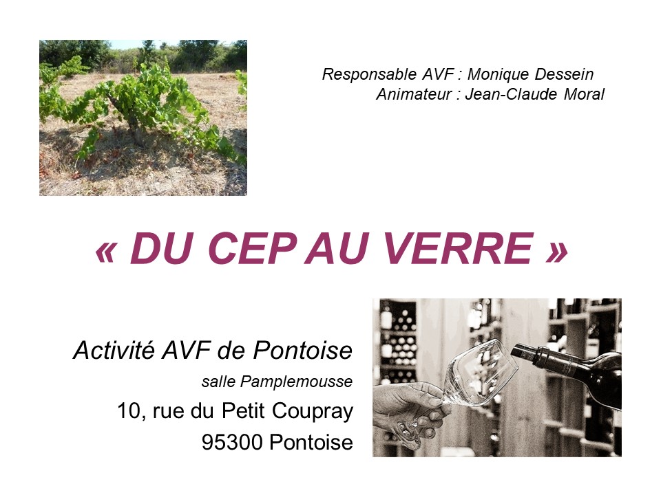 A l’animation « du Cep au Verre », organisĂ©e par Monique Dessein pour AVF Pontoise, on apprend Ă dĂ©guster le vin, mais aussi Ă connaĂźtre les crus pouvant accompagner nos repas. Date : mercredi 4 avril de 10 h Ă 12 h dans la salle pamplemousse, 7 Place du Petit Martroy Ă Pontoise