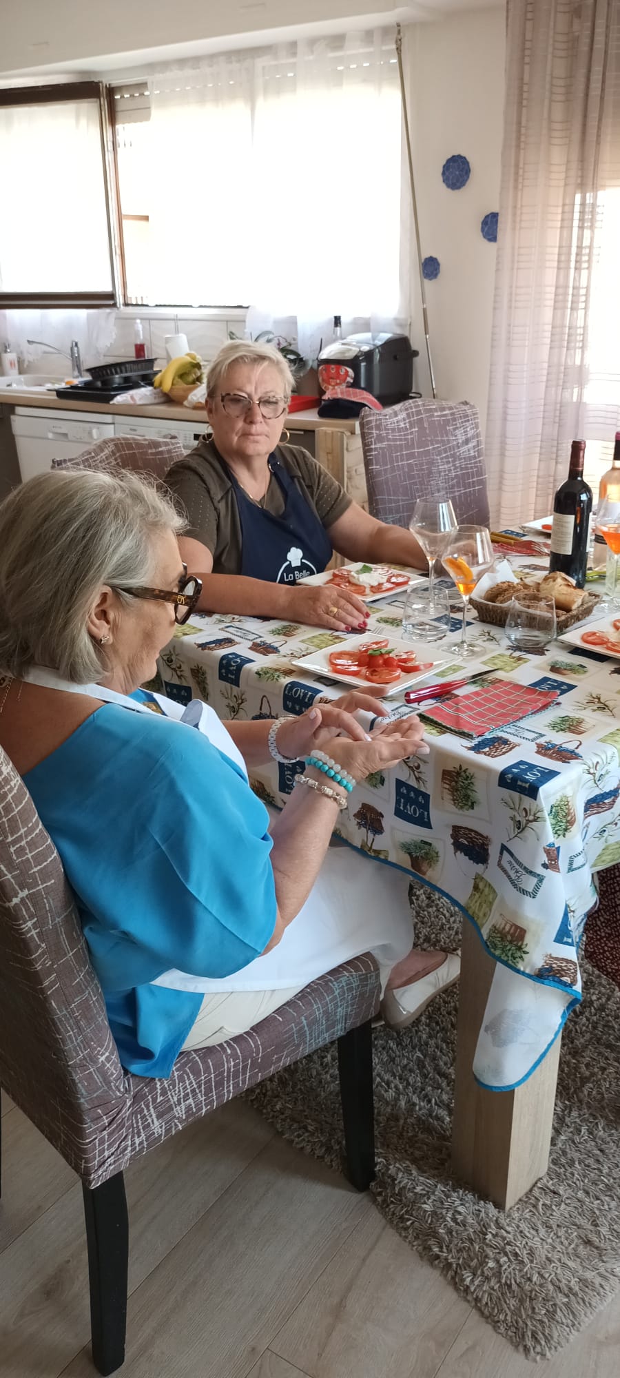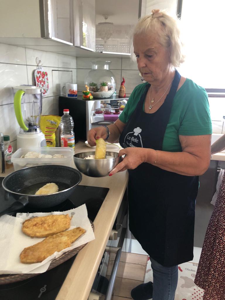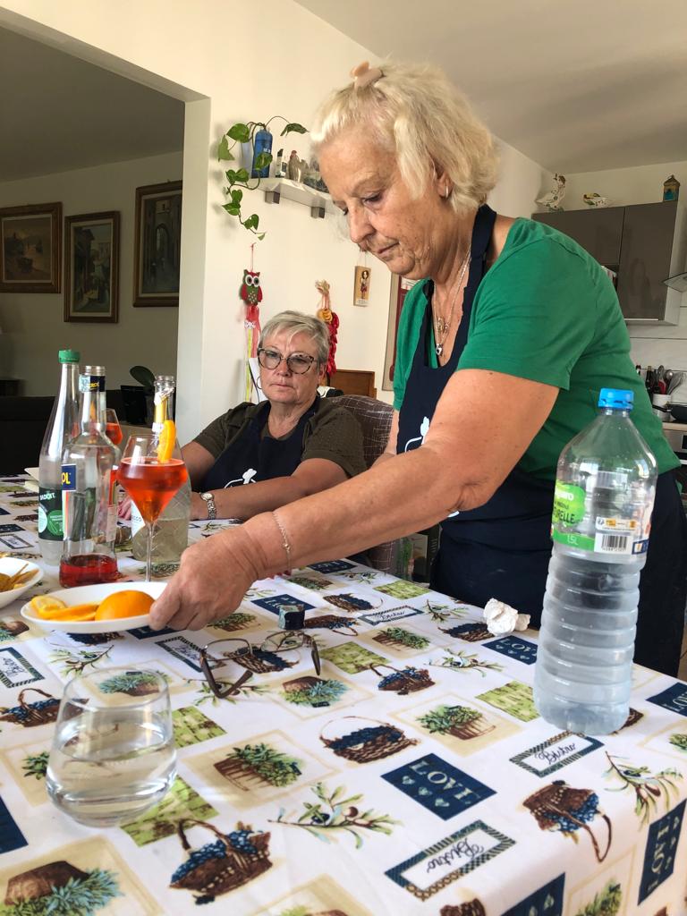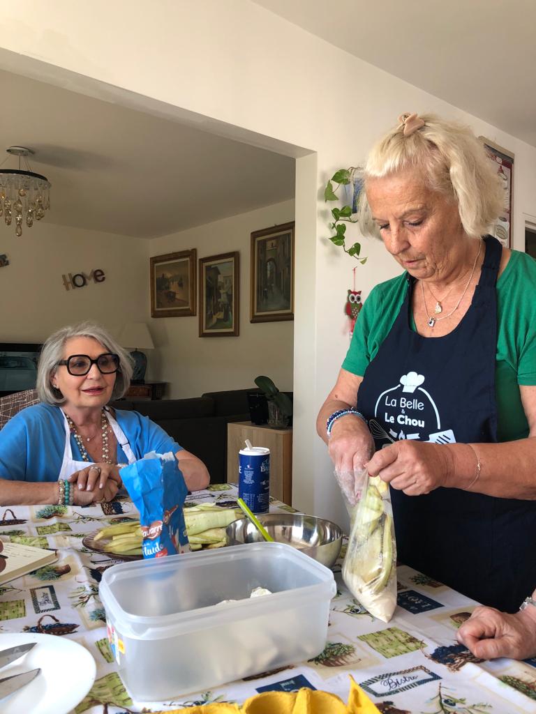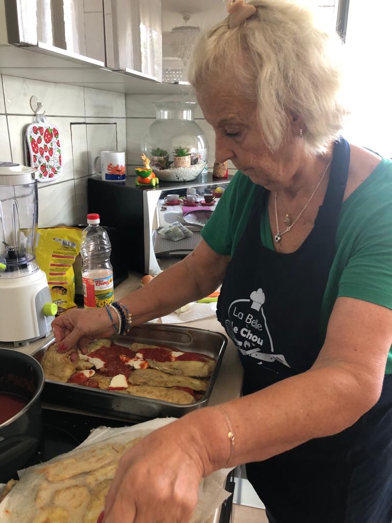 Aujourd’hui atelier cuisine chez Maria !! PrĂ©paration de la « parmigiana » spĂ©cialitĂ© des Pouilles, en Italie. Il s’agit d’un gratin d’aubergines. Ensuite dĂ©gustation du plat prĂ©parĂ© en toute convivialitĂ© avec apĂ©ro « Spritz », entrĂ©e tomates/burrata, dessert gĂąteau glacĂ© nougats et salade de fruits.